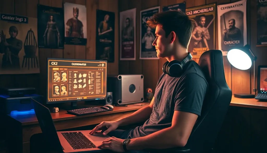 A gamer creating characters on Ck2Generator at a desk filled with strategy guides.